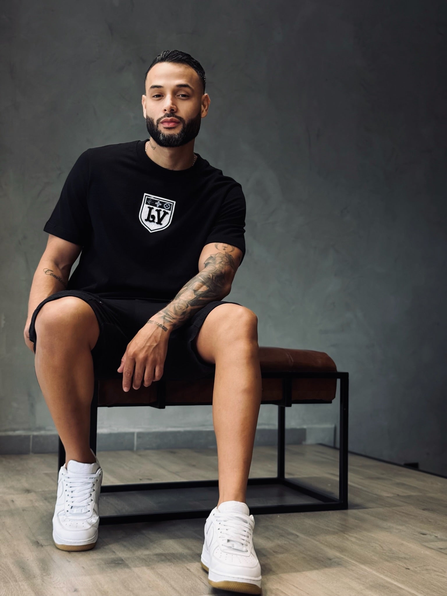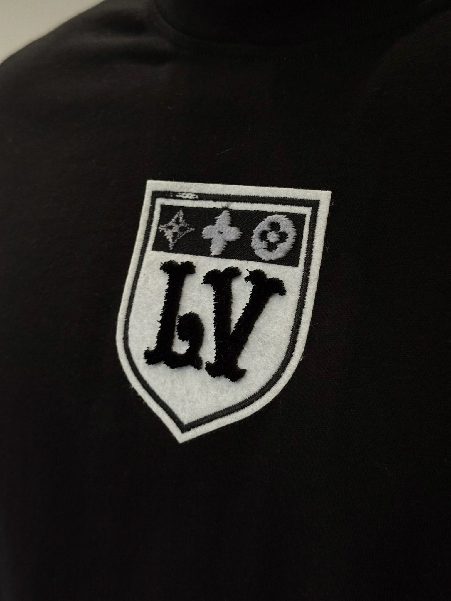 Frente: Detalla un parche bordado con el icónico emblema LV en tonos negros, inspirado en los códigos deportivos de la maison, aportando un toque distintivo y moderno.